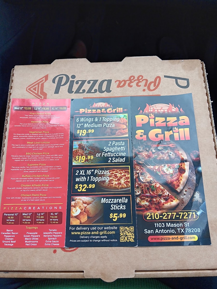 Located at 1103 Mason St, San Antonio, Pizza and Grill offers a delectable fusion of flavors, focusing on both traditional and modern interpretations of pizza and Mediterranean cuisine. The menu boasts a variety of mouthwatering options, from Gyro Sandwich Combos to hearty meat lover’s pizzas. Each dish is crafted with care, ensuring authentic taste and satisfaction.